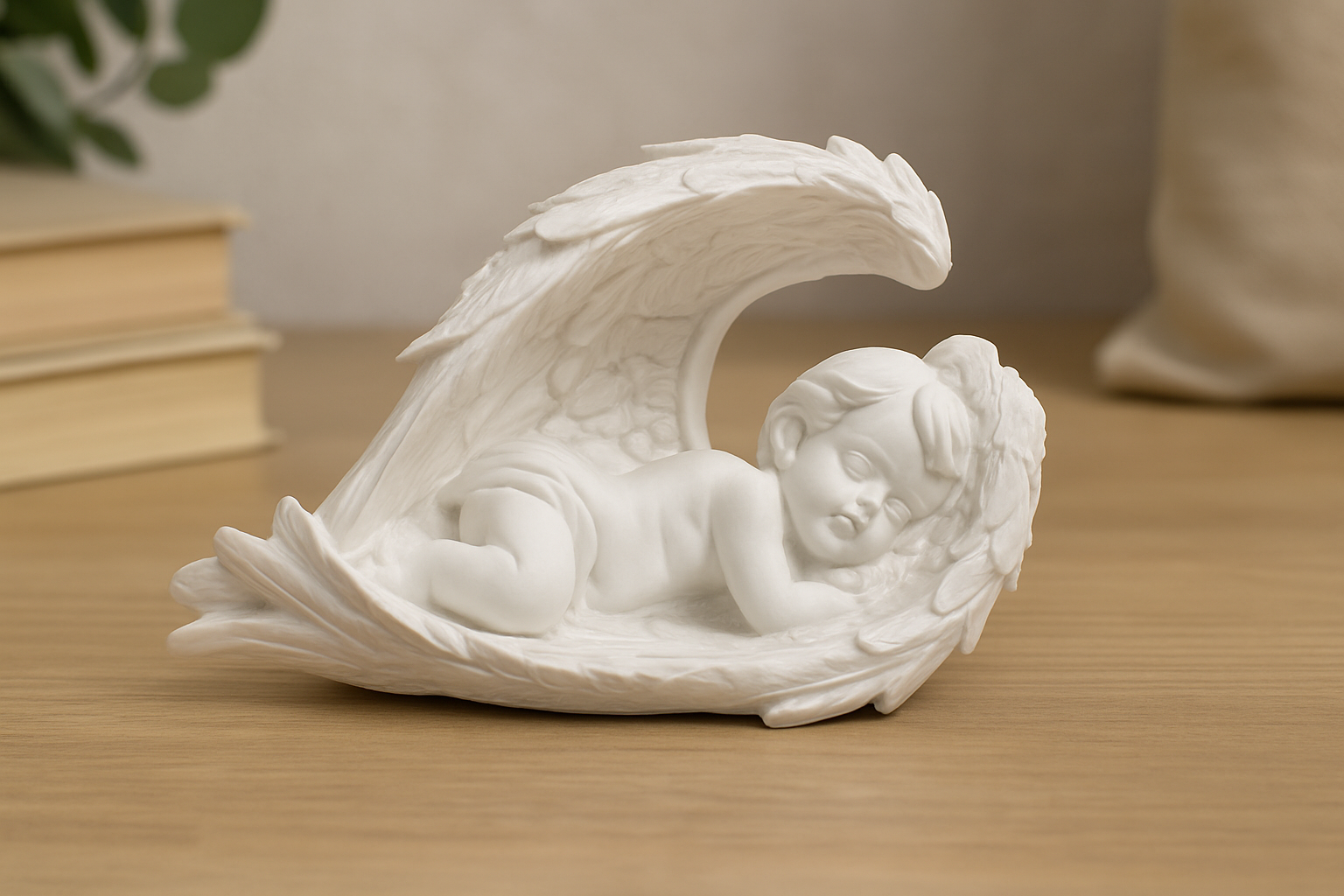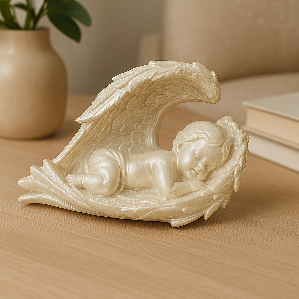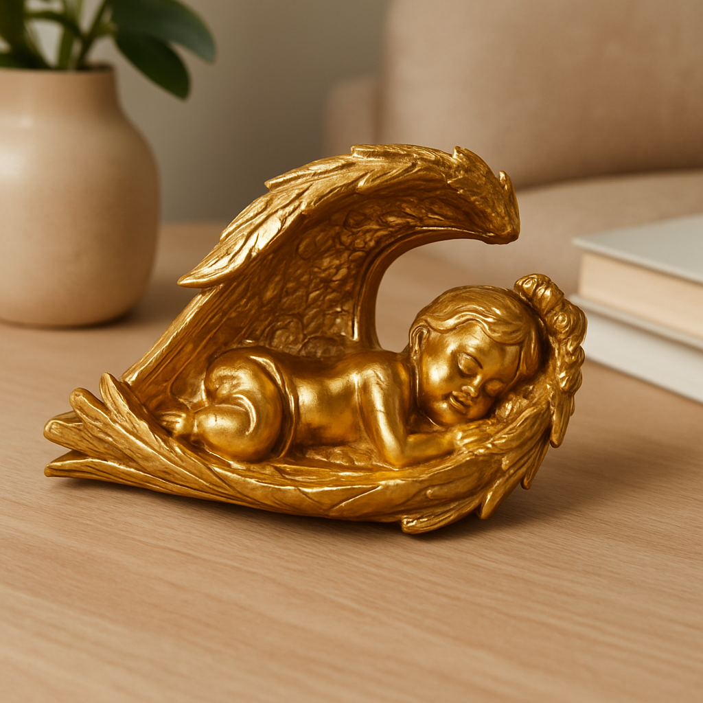 Uyuyan bebek figürlü dekoratif obje, estetik tasarımı ve anlam yüklü duruşuyla dikkat çeken özel bir üründür. Kanatların koruyucu formunda huzurla uyuyan bebek figürü, masumiyetin ve saflığın sembolü olarak mekâna duygusal bir atmosfer katar. Hem görsel zarafeti hem de taşıdığı anlam ile ev ve ofis dekorasyonunda önemli bir yere sahiptir.