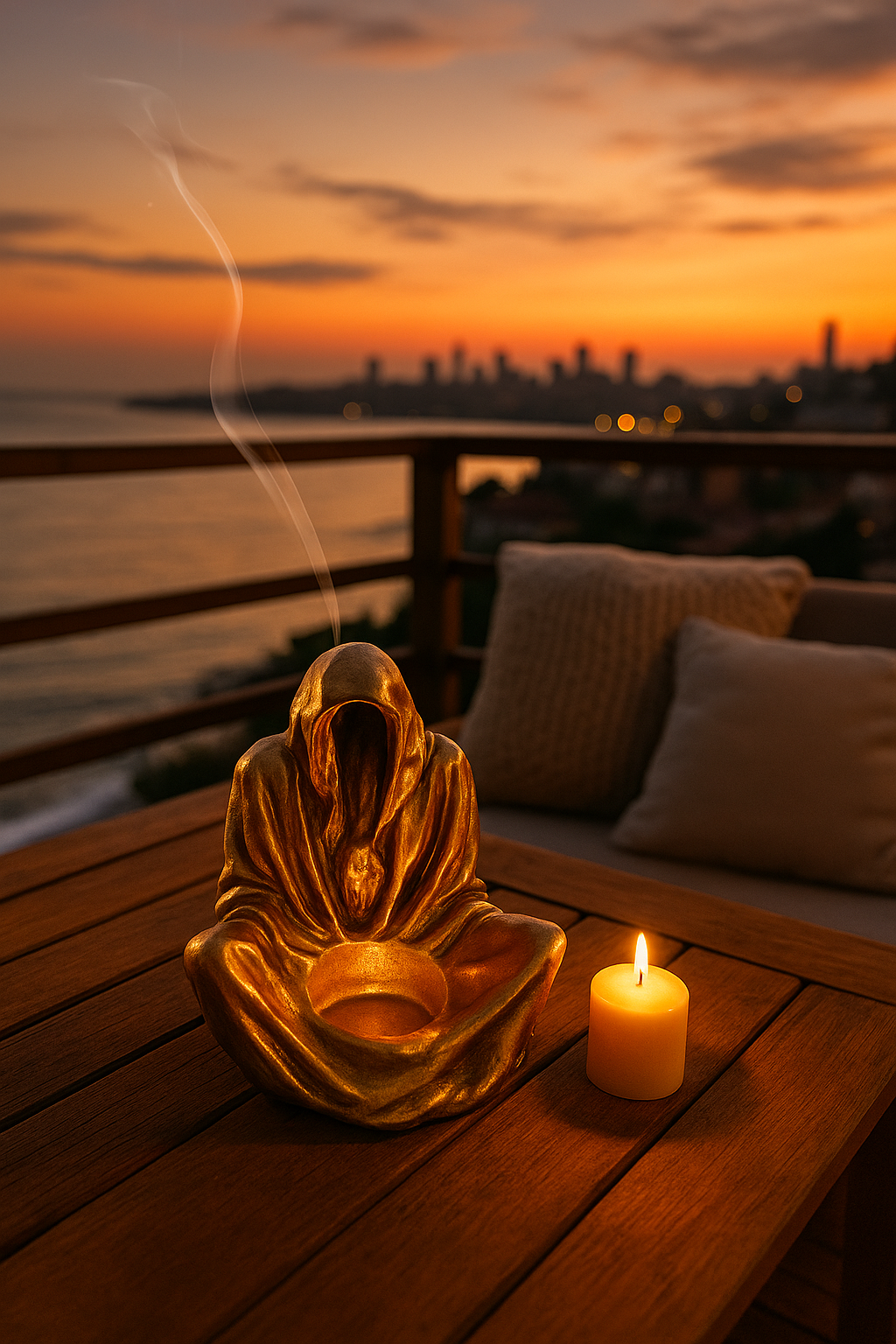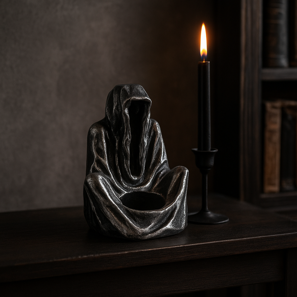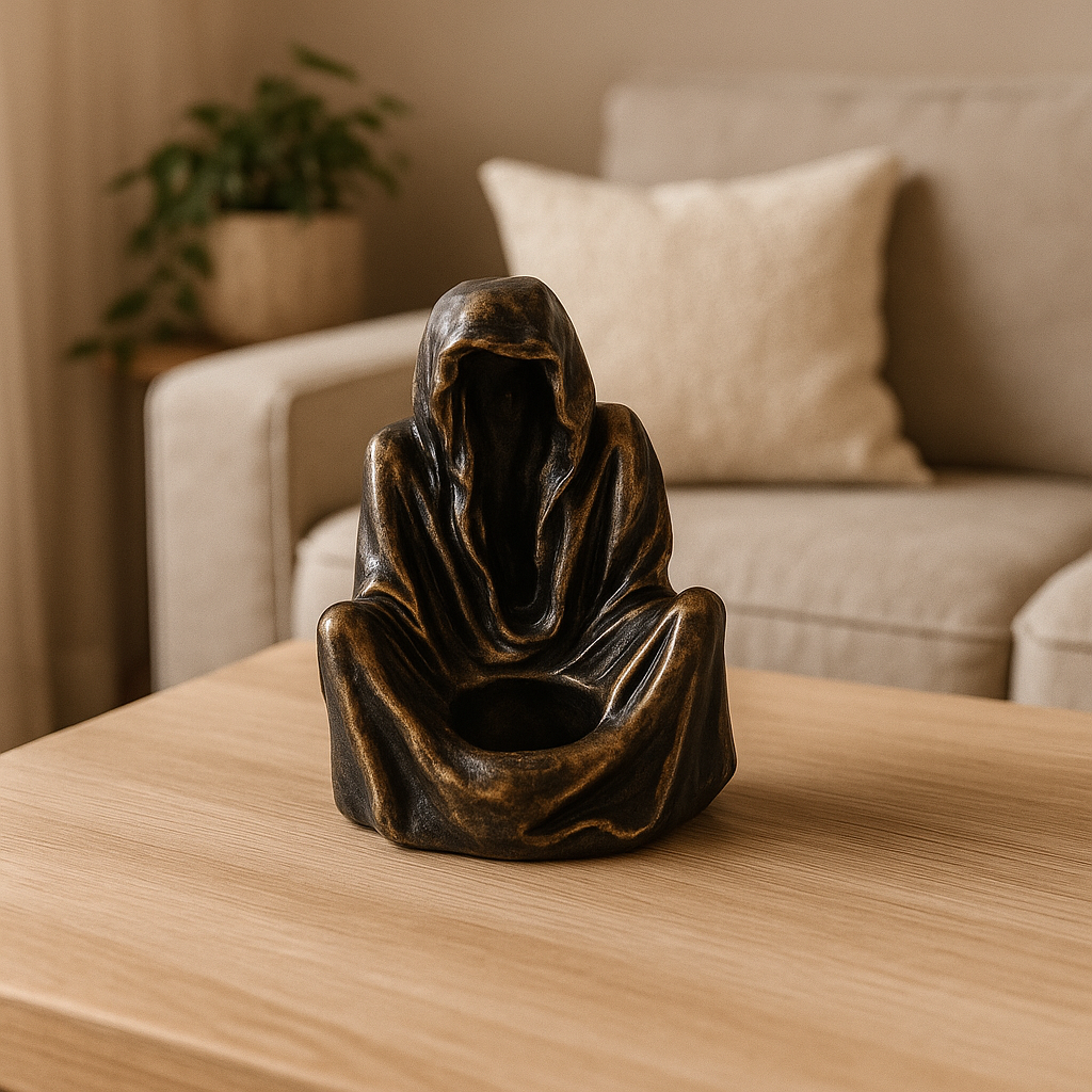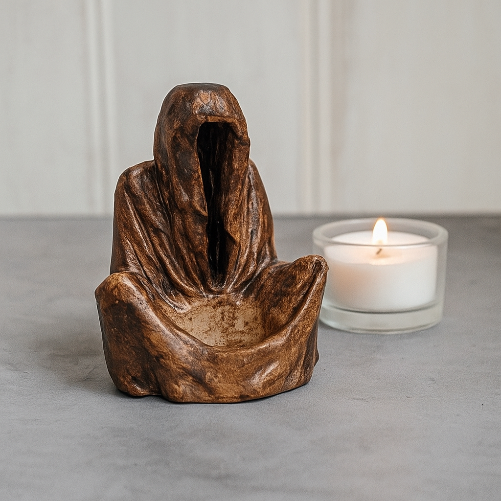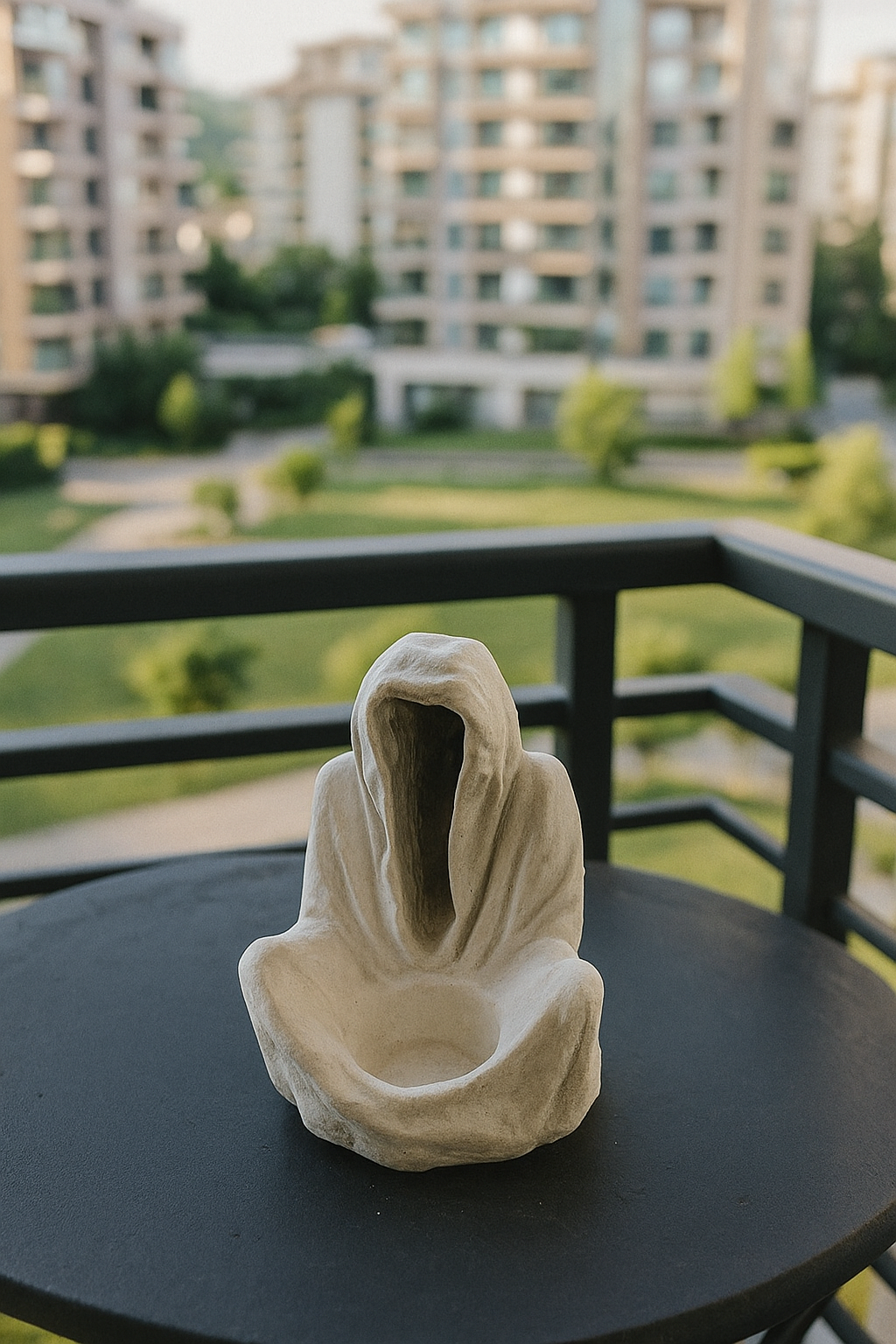 Mistisizm ve gizemi bir arada sunan Cadı Tütsü objesi, kapüşonlu figür tasarımıyla dikkat çeken özel bir dekoratif tütsülüktür. Hem işlevsel hem de sanatsal bir obje olan bu tasarım, tütsü severler için estetik bir deneyim sunar. Tütsü yakıldığında çıkan duman figürün etrafında süzülerek mistik bir görsel şölen oluşturur.