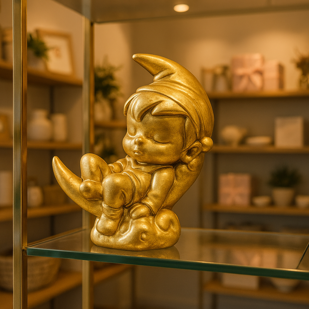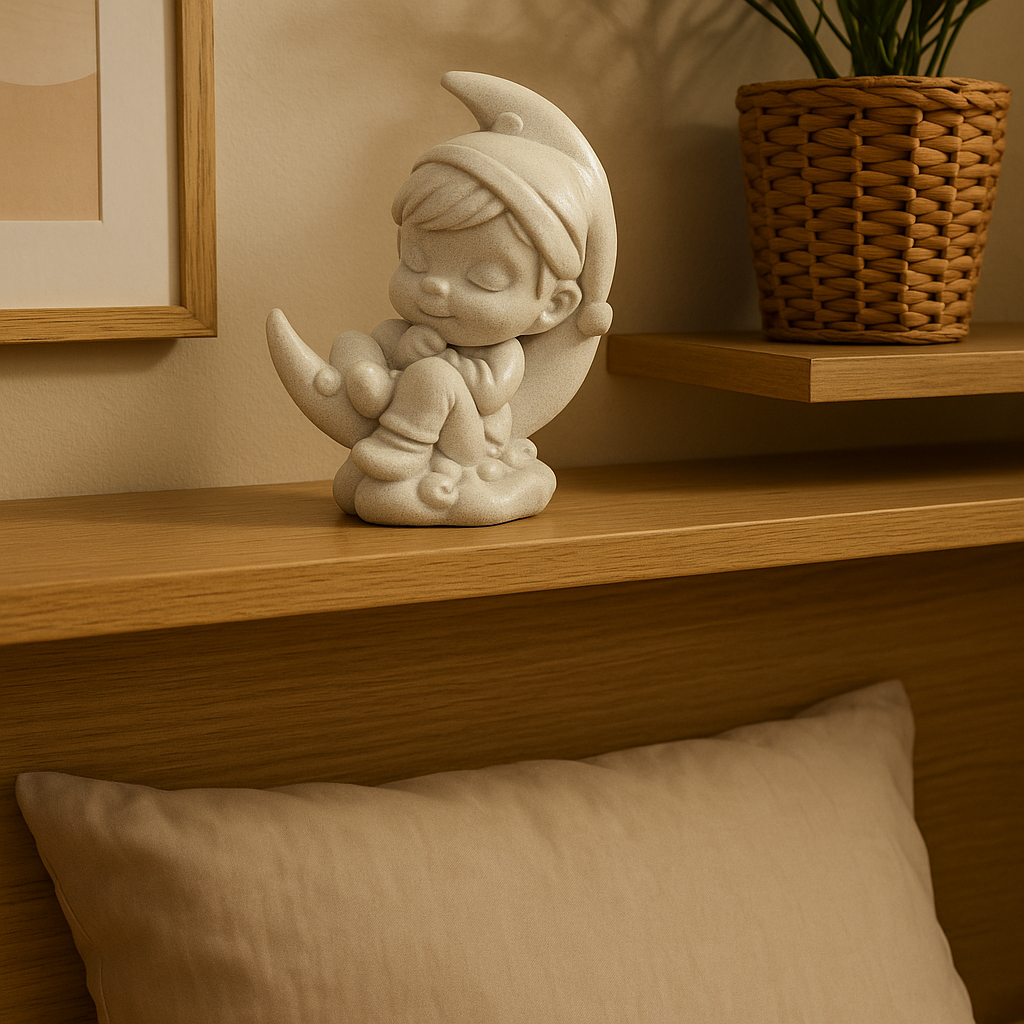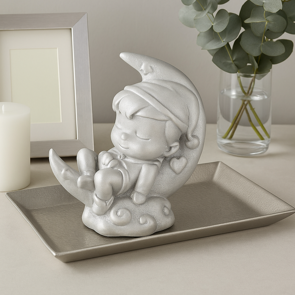 Ayın üzerinde huzurlu bir şekilde uyuyan çocuk figürü, masalsı bir dekoratif obje olarak tasarlanmıştır. Özellikle çocuk odalarında kullanılabilecek bu biblo, sevimli ve anlamlı bir dekorasyon unsurudur. Ay figürü ile bütünleşen çocuk detayı, hayal gücünü ve huzuru temsil eder.