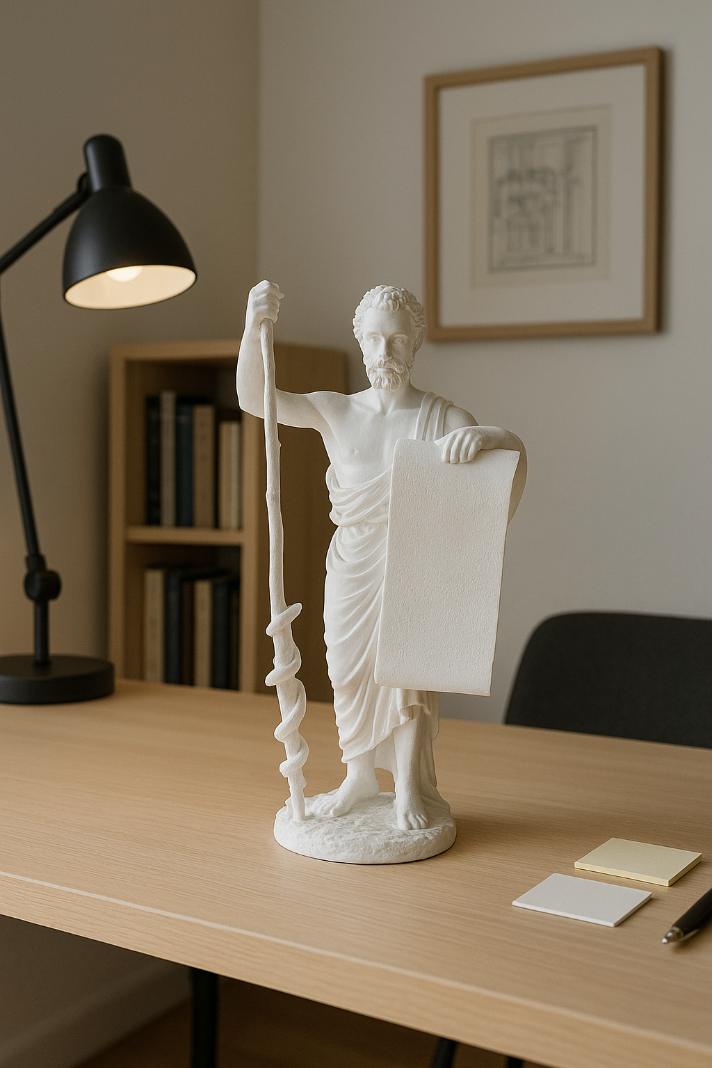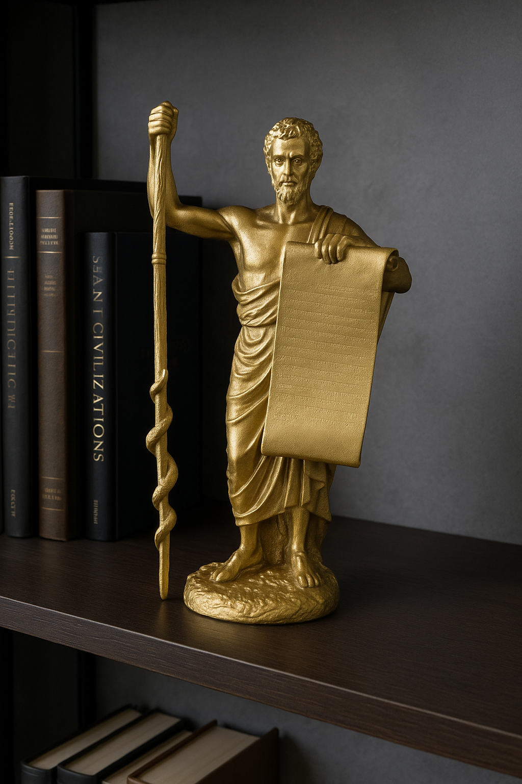 Tıbbın babası olarak anılan Hipokrat’tan ilham alınarak tasarlanan bu heykel, zarif detayları ve sembolik duruşuyla öne çıkmaktadır. Elinde tuttuğu asa ve yazıtla birlikte tasvir edilen figür, yalnızca bir dekoratif parça değil aynı zamanda sanatsal koleksiyon ürünü niteliği taşır. Tarihi ve kültürel bir simgeyi modern mekânlara taşıyan bu eser, bilgi, bilgelik ve sağlık kavramlarını estetik bir şekilde yansıtmaktadır.