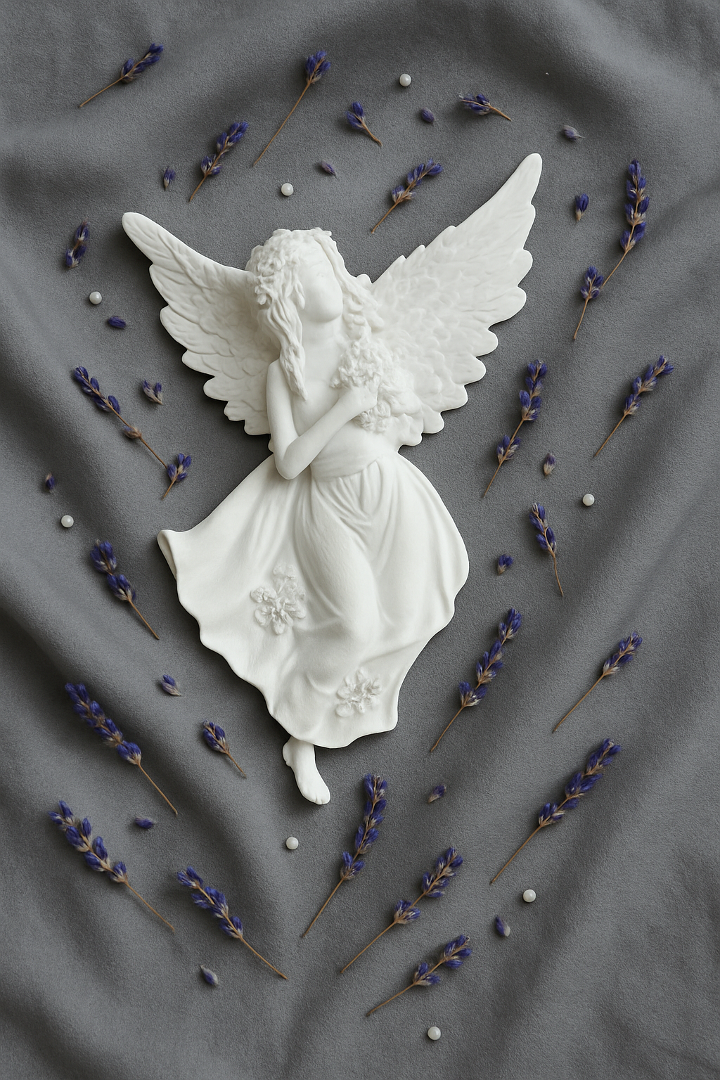Modern ve klasik dekorasyon stillerine uyum sağlayan bu el yapımı melek figürü, koleksiyonluk değere sahip sanatsal bir obje niteliğindedir. Lavanta dallarıyla uyumlu sahne kurgusu, ürünün romantik yönünü ön plana çıkarırken, manevi anlamı da korur.