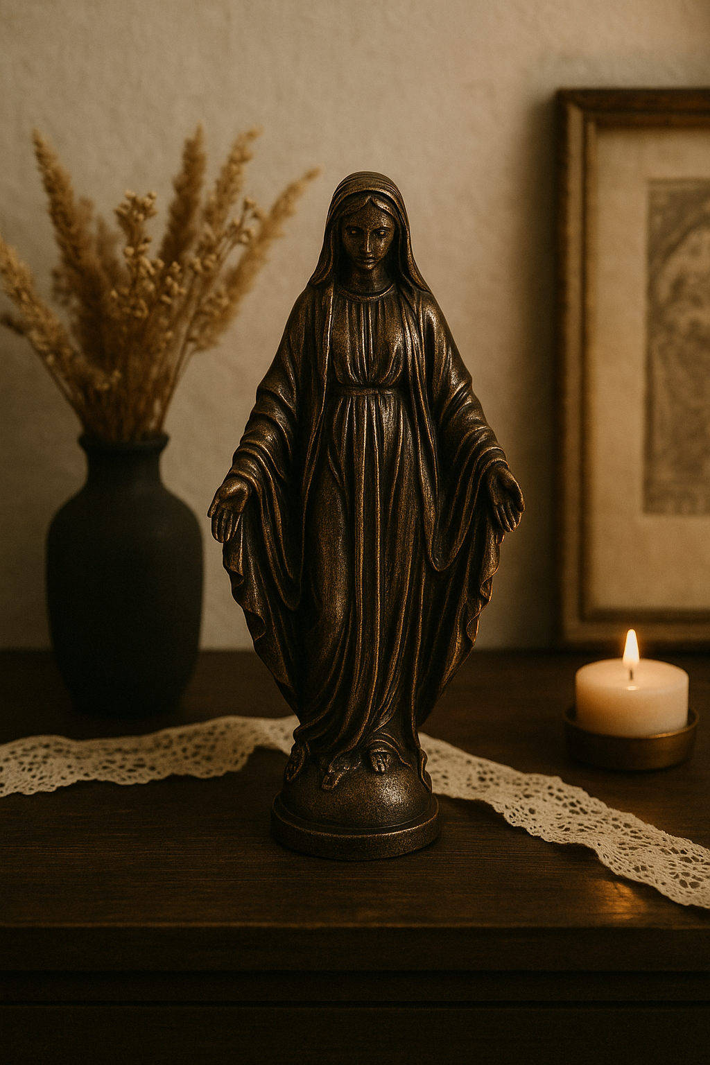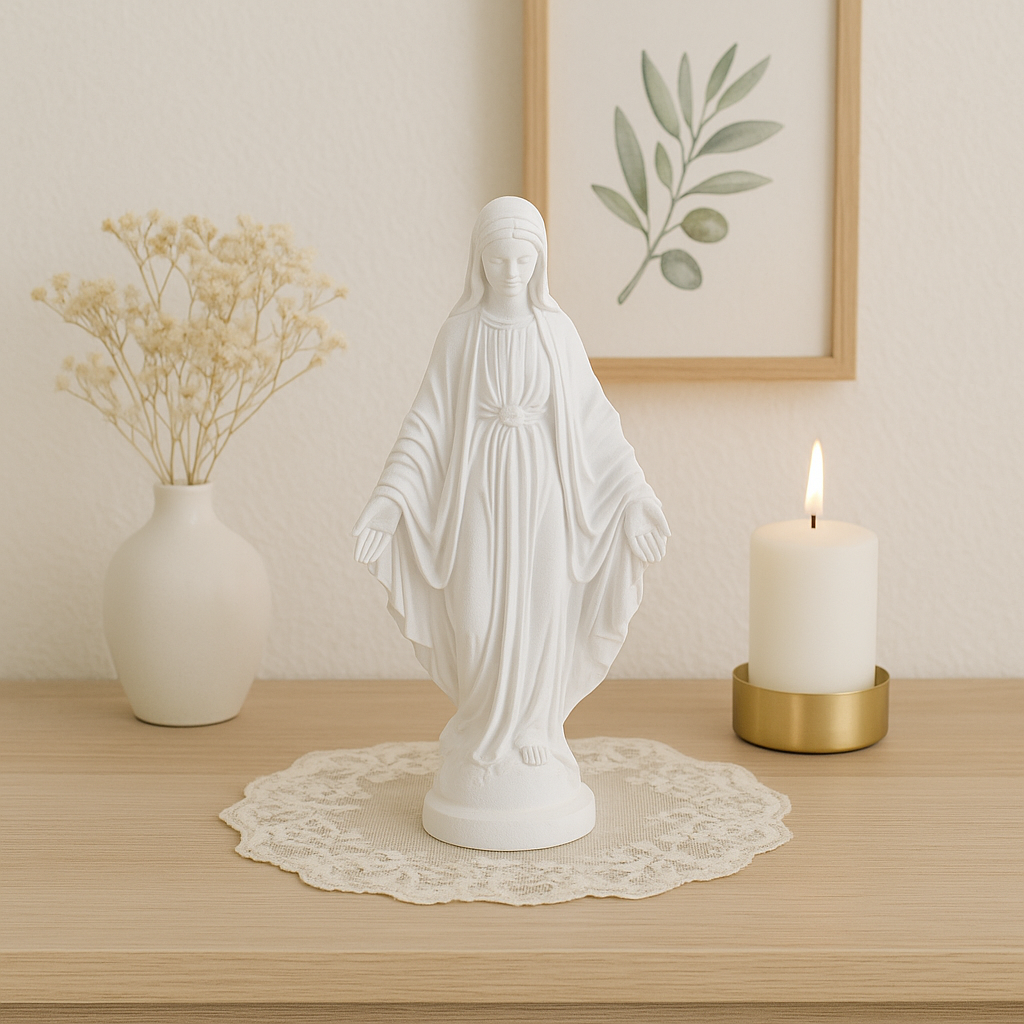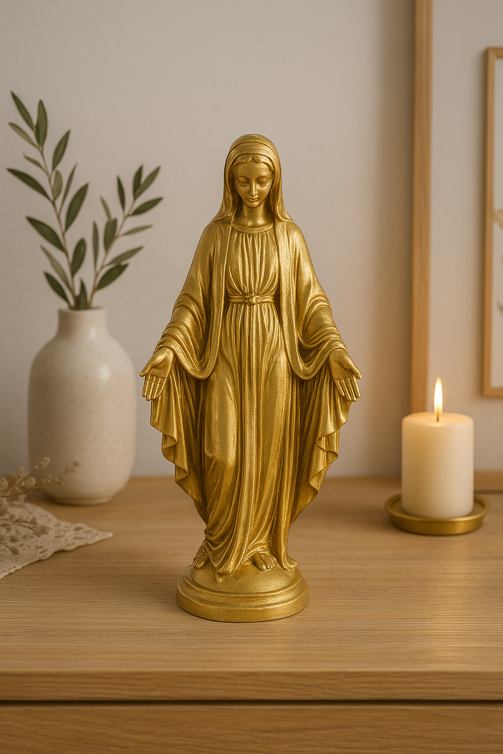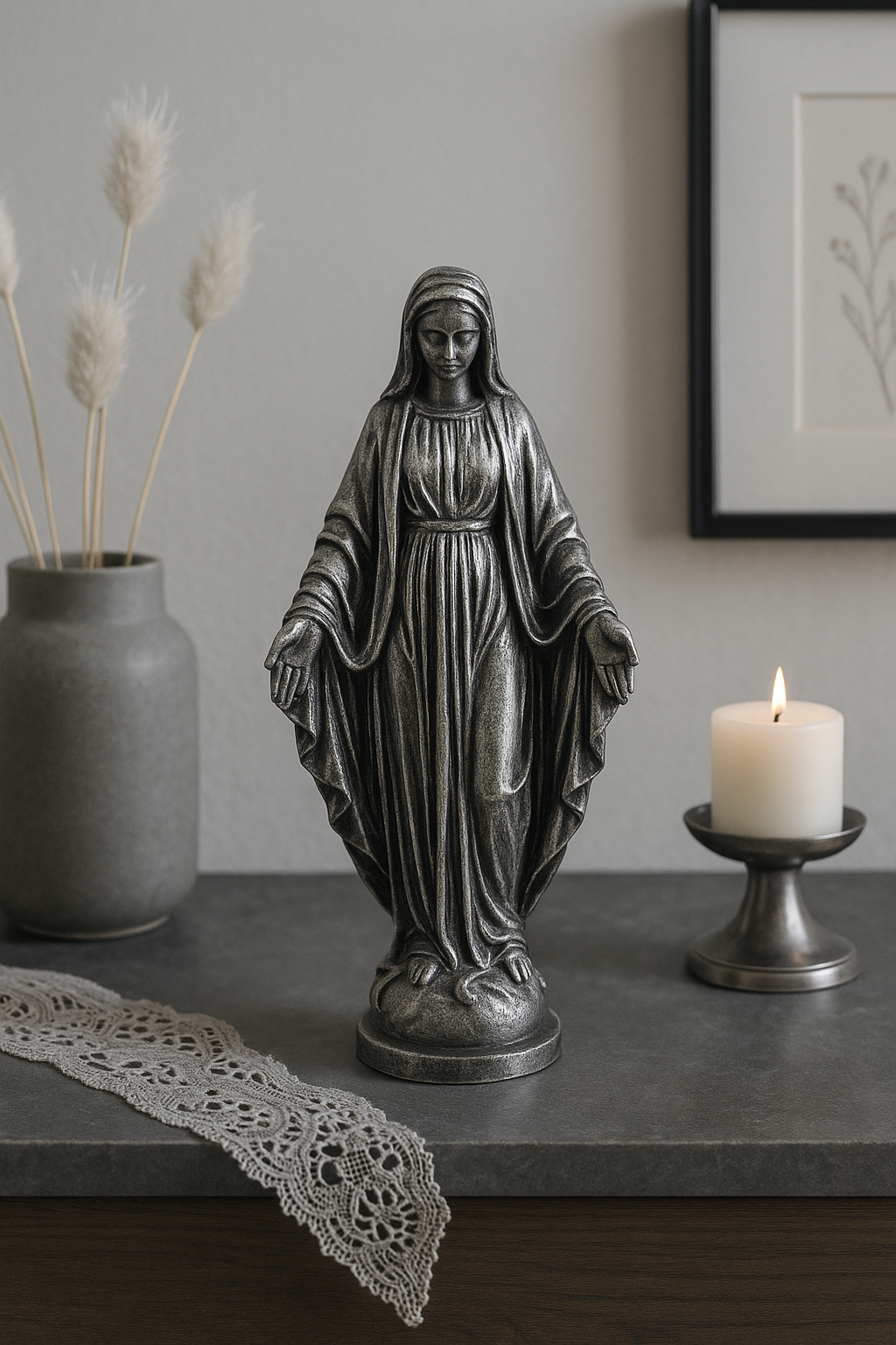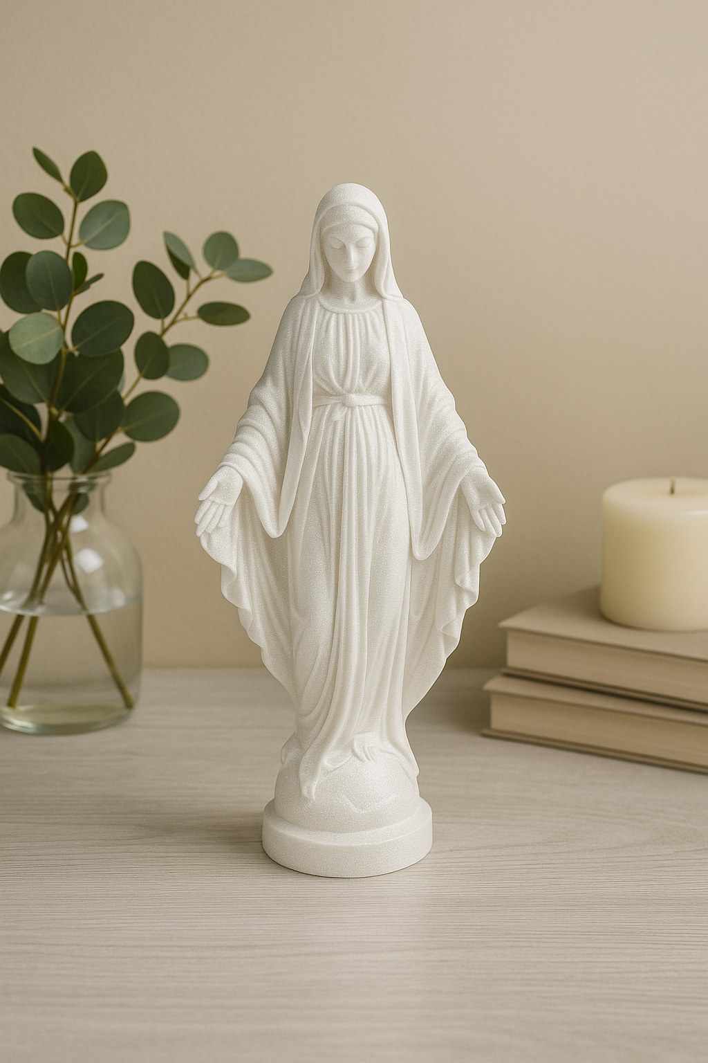 Masaüstünde, konsolda ya da özel köşelerde sergilenebilecek bu el yapımı Meryem Ana heykeli, bulunduğu mekâna dinginlik ve anlam katar. Hem klasik hem de modern dekorasyon stillerine uyum sağlayarak ev, ofis veya ibadet alanlarında estetik bir dokunuş sağlar.