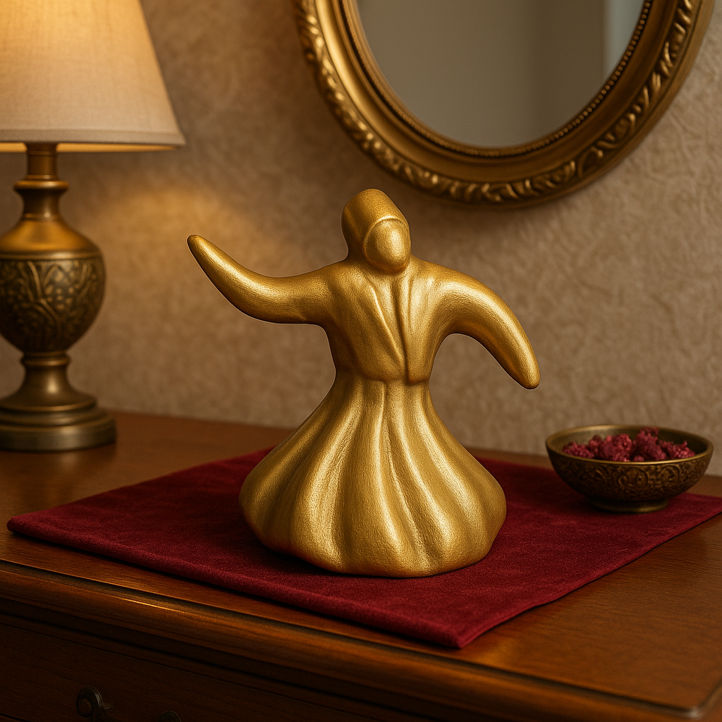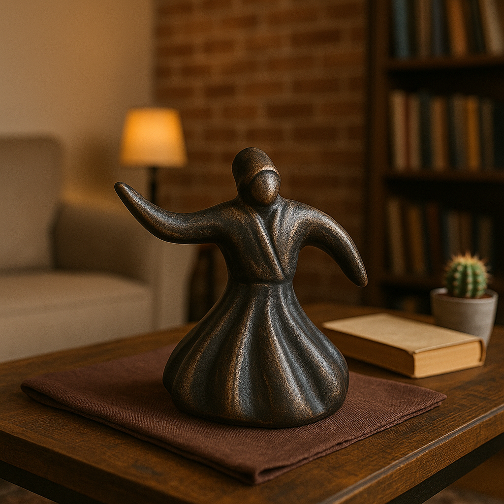Mevlevi geleneğinin zarif bir yansıması olan bu Semazen figürü, huzuru, maneviyatı ve estetiği bir arada sunmaktadır. Dönüş hareketini sade ama etkileyici bir şekilde yansıtan tasarımıyla yalnızca bir dekoratif obje değil aynı zamanda sanatsal koleksiyon ürünü niteliği taşır. İnce detaylarla işlenmiş formu, yaşam alanlarınıza derinlik ve anlam katarken ruhani bir atmosfer oluşturur.