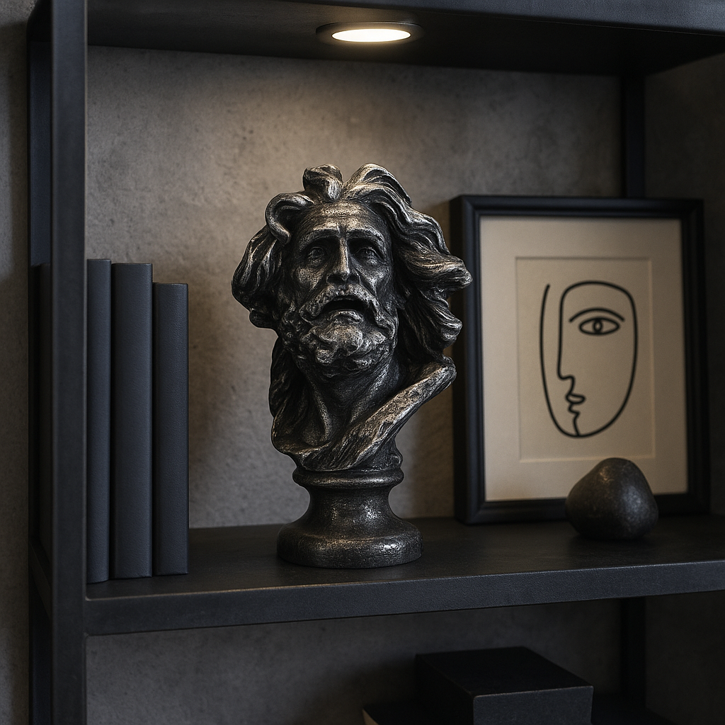Mitolojinin güçlü figürlerinden esinlenilerek hazırlanan bu özel büst, detaylı işçiliği ve heybetli görünümüyle öne çıkmaktadır. Güçlü yüz hatları ve zarif formuyla dikkat çeken tasarım, yalnızca bir dekoratif obje değil aynı zamanda sanatsal koleksiyon ürünü niteliği taşır. Tarihi ve mitolojik ögeleri yaşam alanlarına taşımak isteyenler için özenle üretilen bu parça, bulunduğu ortama derinlik ve karakter kazandırır.