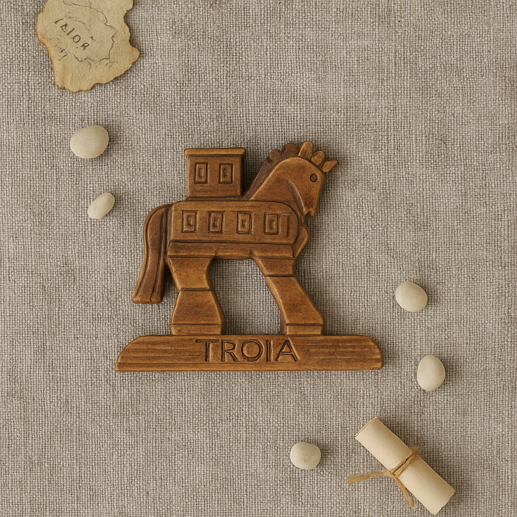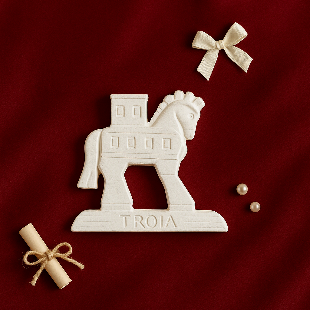 Buzdolabı, pano ya da metal yüzeylerde kullanılabilen bu magnet, şık dekoratif obje olarak günlük yaşamda zarif bir dokunuş sağlar. Hem işlevsel hem de estetik açıdan değerli olan bu parça, Truva efsanesini sevenler için sanatsal dekorasyon ürünü niteliği taşır.