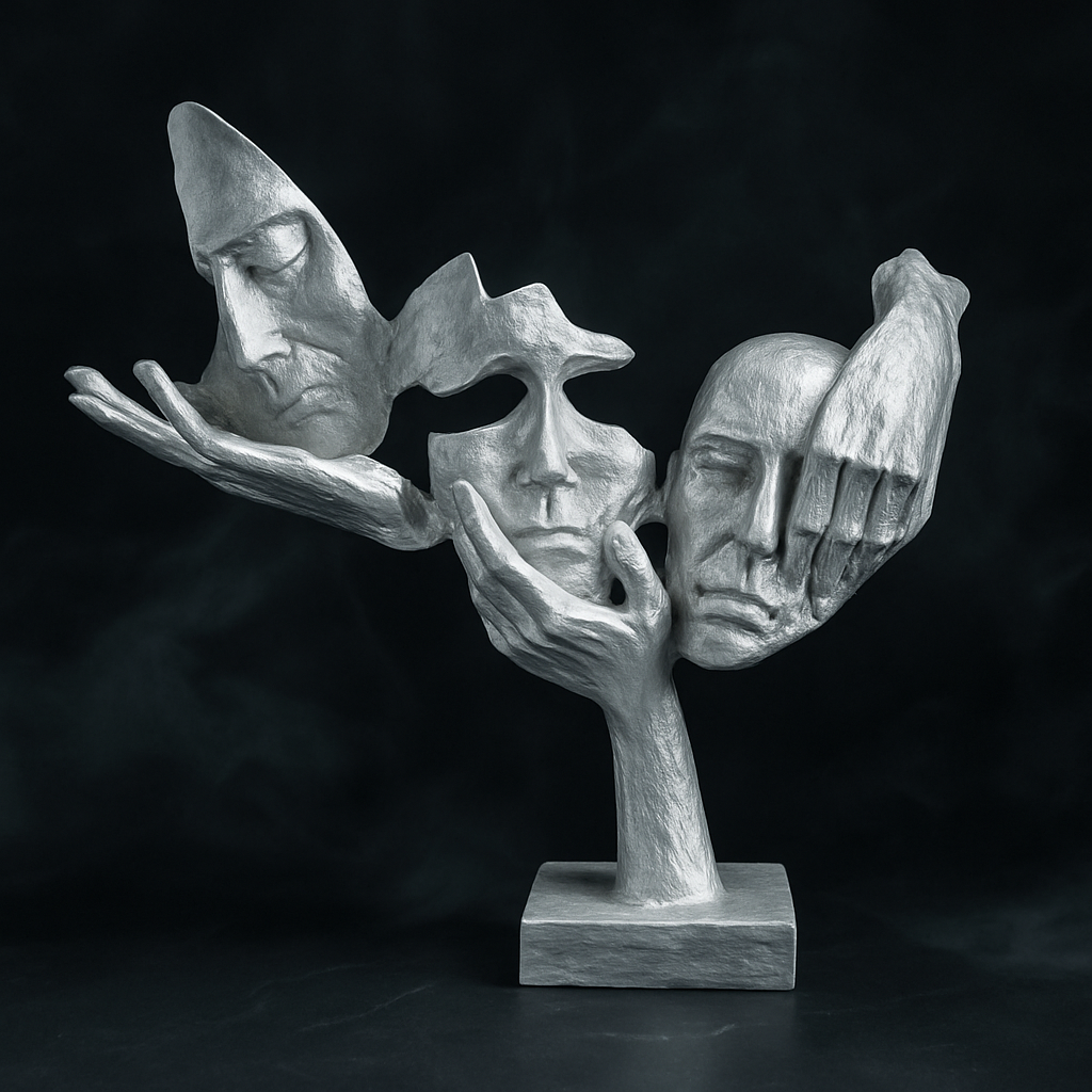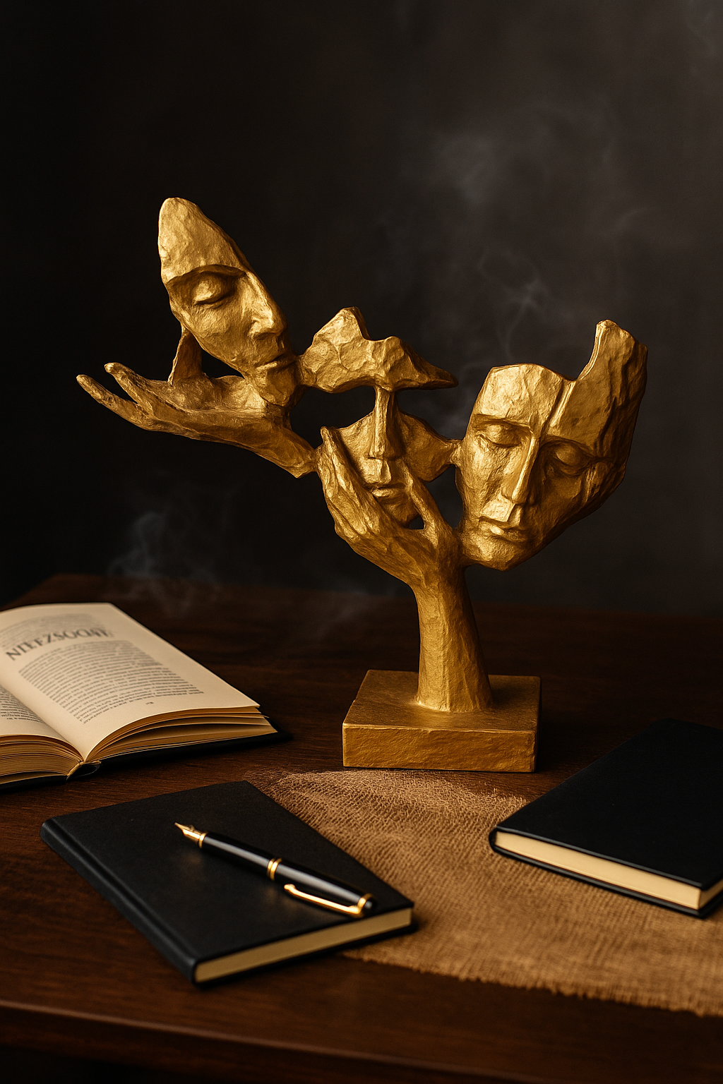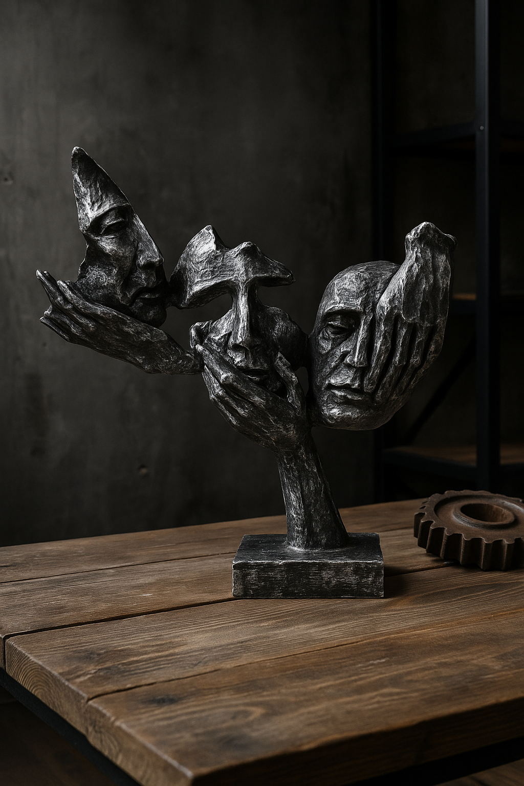 Sanatsal tasarımı ve derin anlamıyla öne çıkan Üçlü Surat heykeli, farklı yüz ifadelerini aynı kompozisyon içinde birleştiren özgün bir dekoratif objedir. El figürleriyle desteklenen yüzler, insanın farklı ruh hallerini, içsel çatışmalarını ve çok yönlü duygularını sembolize eder. Bu özel tasarım, sadece estetik bir obje değil aynı zamanda düşünsel bir sanatsal ifade niteliği taşır.